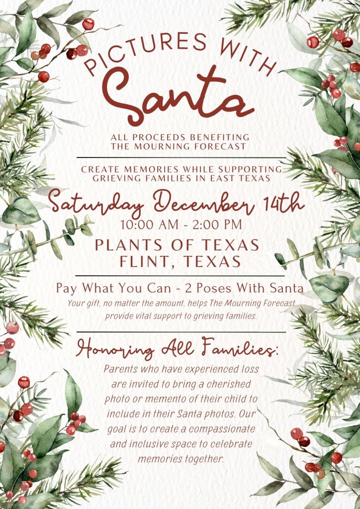 At The Mourning Forecast, we understand that the holiday season can be a tender time for families who have experienced the loss of a child. This year, we’re hosting a Photos with Santa event to create a welcoming, supportive space for all families—especially those carrying the memories of a loved one. We invite you to join us on Saturday, December 14th, from 10:00 AM to 2:00 PM, at Plants of Texas in Flint, Texas, for this special fundraiser event.
